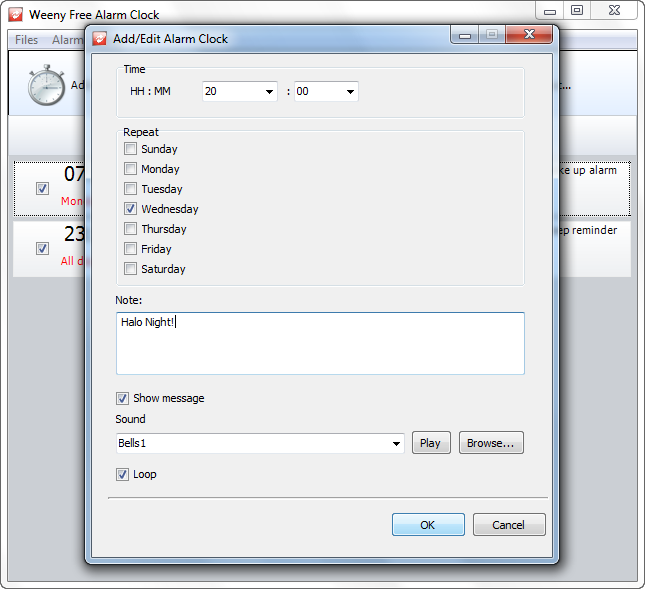 Alarm Clock is a free alarm clock software for Windows to set as many alarms as you want. You can set one-time alarms or repeating alarms which will be activated only from Monday through Friday and give you a chance to sleep on the weekends. Each alarm clock can be set to loop, snooze, wake up the computer from a sleep mode or turn on the monitor power.